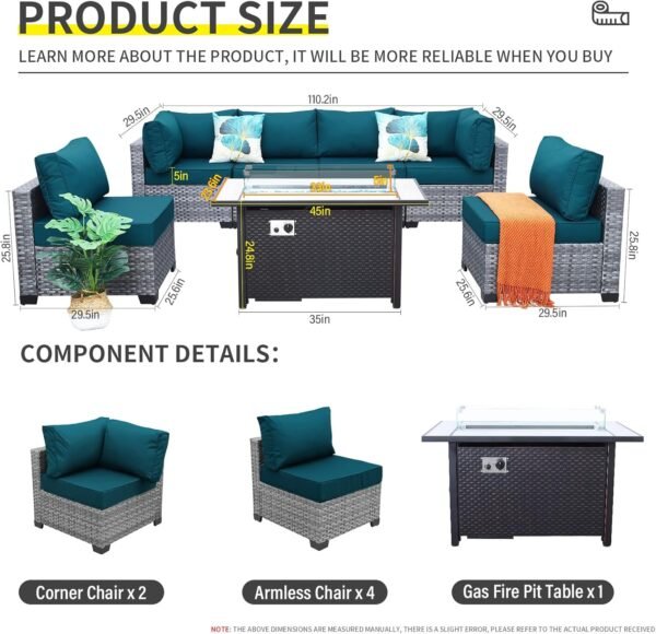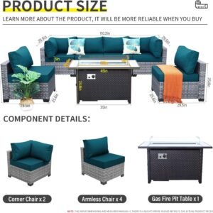 7 Pieces Wicker Patio Furniture Set,PE Rattan Outdoor Sectional Conversation Sofa Set with Fire Pit Table, Non-Slip Cushions and Furniture Cover, Peacock Blue 7 Pieces Wicker Patio Furnitur...