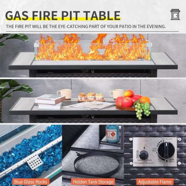 You’ll be amazed at how beautiful the furniture set is! The light grey wicker makes the furniture look superior and gorgeous; and the stylish peacock blue cushion covers will add a lively atmosphere to your patio. Moreover, this eye catching fire pit table can also be used as a coffee/dining table. Let’s enjoy a more colorful outdoor leisure time…
