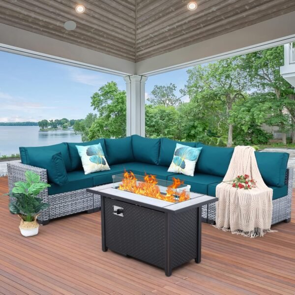 5 reviews for 7 Pieces Wicker Patio Furniture Set,PE Rattan Outdoor Sectional Conversation Sofa Set with Fire Pit Table, Non-Slip Cushions and Furniture Cover, Peacock Blue