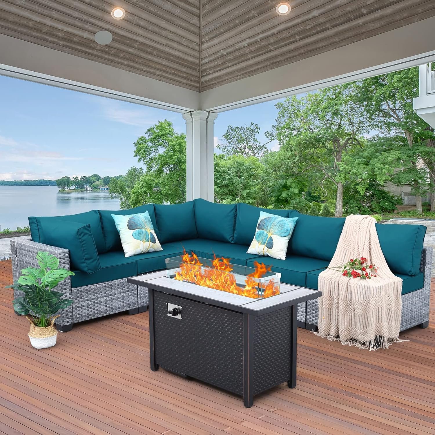• 7 Pieces Wicker Patio Furniture Set,PE Rattan Outdoor Sectional Conversation Sofa Set with Fire Pit Table, Non-Slip Cushions and Furniture Cover, Peacock Blue